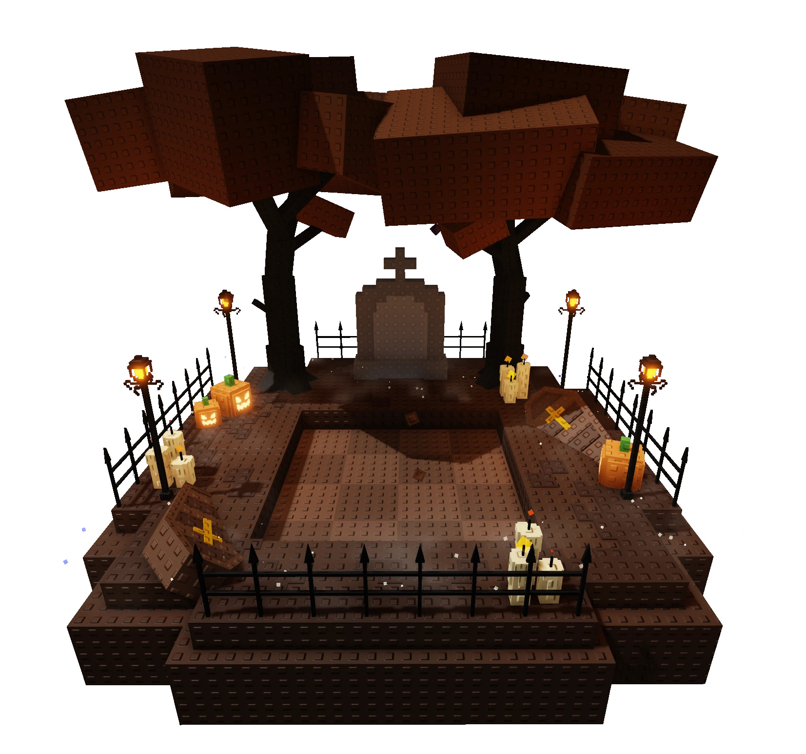 In the Halloween Event, the Digging Platform NPC would appear every 2 hours and only lasted for 1 hour. During this time, interacting with the NPC would transition the player's screen to the Halloween Digging Platform which resembled a gravesite with a dark brown island surrounded by black fences with candles, pumpkins and caskets decorated around the island. There are two trees with brown leaves and a medium-sized gravestone in between.